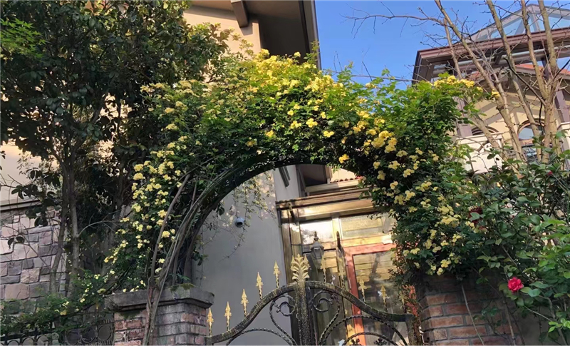 精心打造的绿植花架以及为小鱼塘选择的设计感满分的圆顶凉亭,显示出主人对美好生活的盼望;爬藤蔷薇门、红冬青、蓝金地毯等等这些寓意美好的装饰也都富含巧思,还有时不出产的各色新鲜瓜果,处处都能看出陈教授的用心和这个家的诗意。陈教授还会在我们定期上门进行电梯维护保养时,和工作人员分享庭院出产的新鲜瓜果,暖意融融。